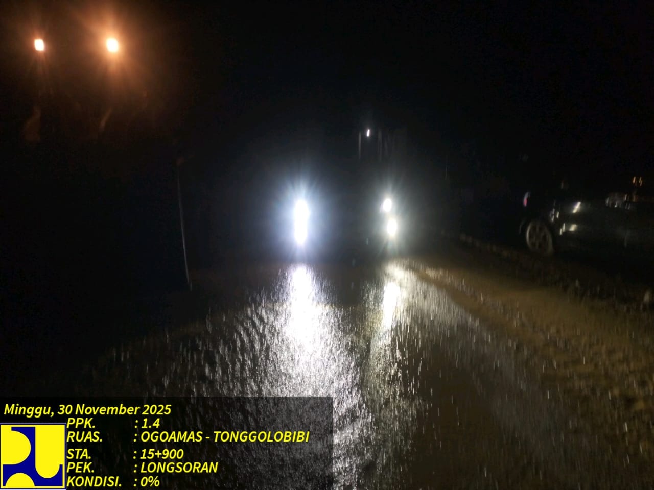 Jalan yang sebelumnya tertutup longsor di ruas Ogoamas – Tonggolobibi kini kembali normal, Minggu pagi, 30/11/2025. Foto: BPJN Sulteng