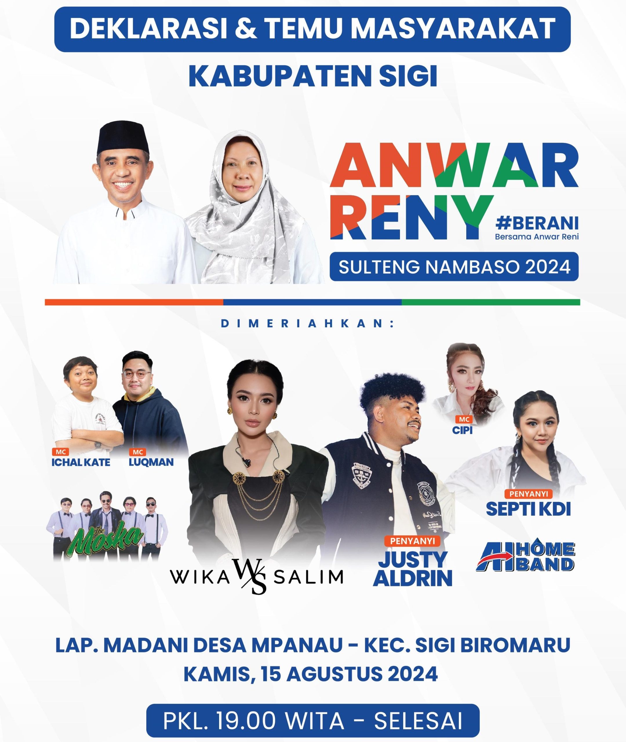 Pada Kamis malam ini, 15 Agustus 2024, Anwar dan Reny akan melanjutkan rangkaian deklarasi mereka di Desa Mpanau, Kecamatan Sigi Biromaru, Kabupaten Sigi. Acara yang akan dimulai pukul 19.00 WITA ini akan digelar di lapangan sepak bola Madani Biromaru dan dipastikan akan berlangsung meriah dengan kehadiran sejumlah artis ibu kota, seperti Justyn Aldrin, Wika Salim, Septi KDI, dan The Mozka yang siap menghibur warga.