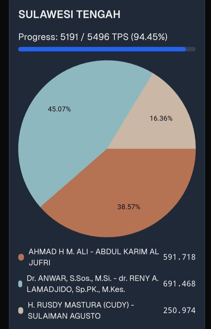 Hingga data masuk dari 5.274 TPS (95,96 persen), Anwar-Reny telah mengantongi 700.857 suara. Posisi kedua ditempati pasangan nomor urut 1, Ahmad M. Ali dan Abdul Karim Aljufri, dengan 600.427 suara (38,59 persen). Sementara pasangan nomor urut 3, Rusdy Mastura dan Sulaiman Agusto, berada di posisi terakhir dengan 254.676 suara (16,37 persen).