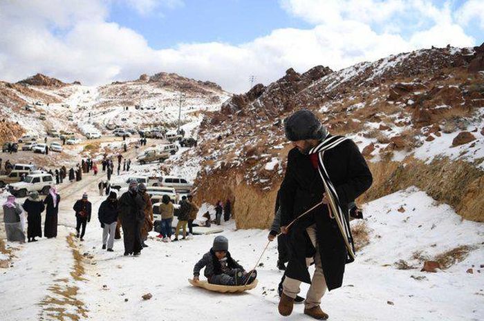 Posrakyat.com – Arab Saudi yang dikenal dengan gurun pasir luasnya, kini dihujani salju yang cukup tebal. Kejadian tersebut terjadi di Tabuk, Arab Saudi. Saat ini, sudah banyak video amatir tentang turunnya salju tersebut yang terjadi pada Sabtu (11/1/2020).