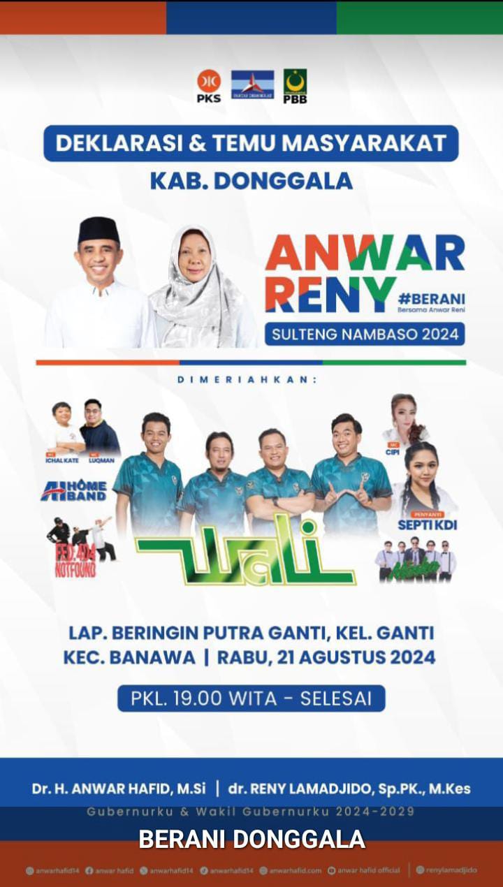 Deklarasi dan Temu Masyarakat yang akan dimeriahkan Band Wali ini akan berlangsung di Lapangan Beringin Putra, Kelurahan Ganti, Kecamatan Banawa, pada Rabu 21 Agustus 2024 mulai Pukul 19.00 Wita.