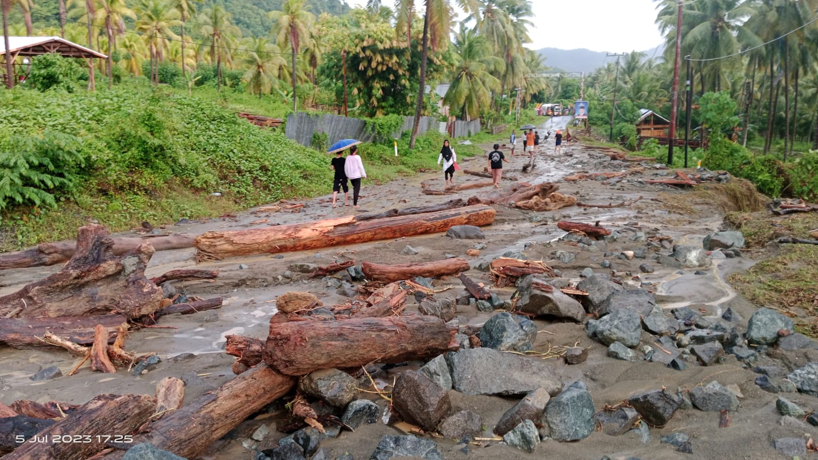 Banjir bandang yang terjadi di desa Huhak kecamatan Bunta kabupaten Banggai menutup akses jalan Trans Sulawesi, Rabu, 5 Juli 2023. Foto: IST