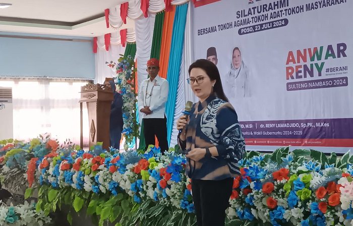 PosRakyat – Bupati Poso, dr. Verna Inkiriwang memberikan testimoni sosok bakal calon gubernur dan wakil gubernur Anwar Hafid dan dr. Reny Lamadjido dalam acara silatuhrahmi yang dihadiri ratusan tokoh agama, tokoh adat serta tokoh masyarakat, di Gedung Darmawanita, Kabupaten Poso, Selasa, 23 Juli 2024.