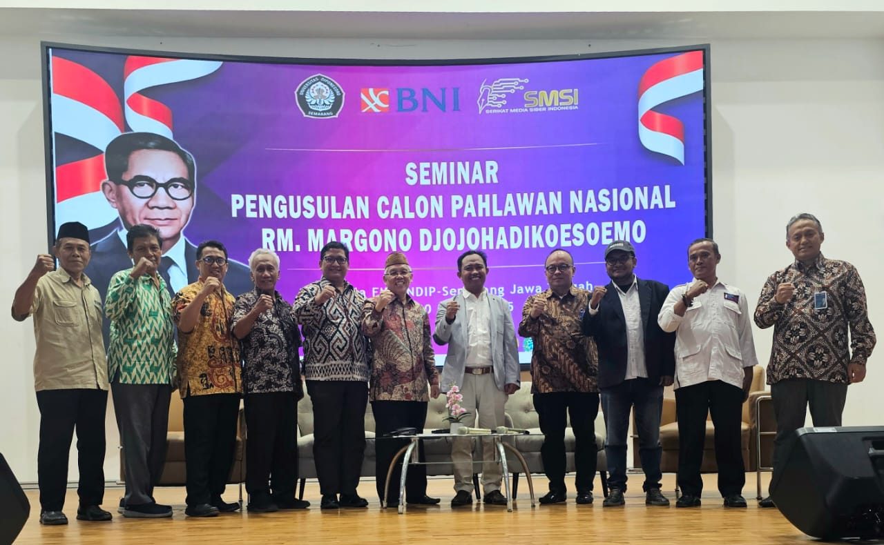 PosRakyat – Dalam rangka pengusulan RM Margono Djojohadikusumo Jadi Pahlawan Nasional, Serikat Media Siber Indonesia (SMSI) usai gelar Seminar Kabupaten kolaborasi dengan Seruling Mas diPurwokerto pada Selasa (18/3/2025), kembali SMSI gelar seminar di tingkat provinsi Jawa Tengah, diadakan di Art Center Fakultas Ilmu Budaya (FIB) Universitas Diponegoro (Undip) Semarang (20/3/25).