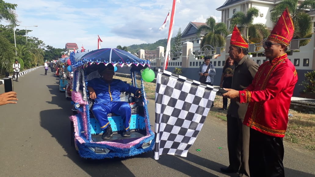TOUNA,Posrakyat.com–Dalam rangka memeriahkan hari ulang tahun (HUT) Kabupaten Tojo Una-Una (Touna) yang ke-16, Pemerintah Daerah menggelar Pawai Bentor (becak motor) hias, Rabu (18 /12/ 2019).