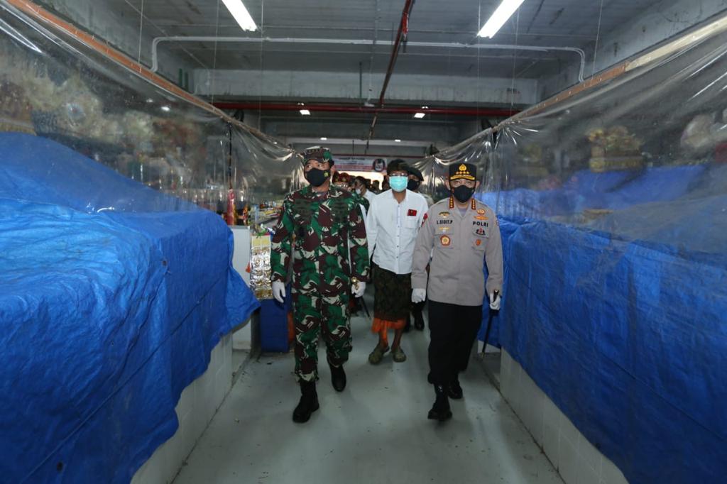 Panglima dan Kapolri didampingi Gubernur Bali I Wayan Koster bersama jajaran. Disana mereka memberikan sosialisasi kepada masyarakat serta pedagang di Pasar Tradisional dan membagi-bagikan masker.