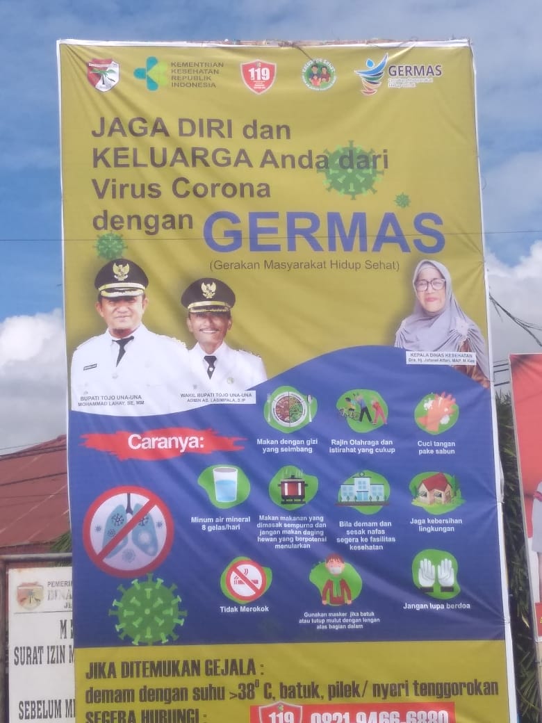 Touna, PosRakyat.com – Dinas Kesehatan kabupaten Tojo Una-Una memasang imbauan terkait pencegahan virus corona (Covid – 19). Imbauan itu dipasang melalui baliho, spanduk dan sarana publikasi lainnya.