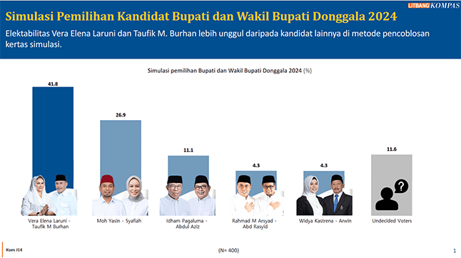 PosRakyat – Menjelang pemungutan suara yang tinggal hitungan hari, pasangan calon (Paslon) Bupati dan Wakil Bupati Donggala nomor urut 3, Vera Elena Laruni dan Taufik M. Burhan, mencatat elektabilitas tertinggi berdasarkan survei terbaru Litbang Kompas. Pasangan yang mengusung jargon “Vegata” ini meraih dukungan sebesar 41,8%, jauh melampaui empat pasangan calon lainnya.