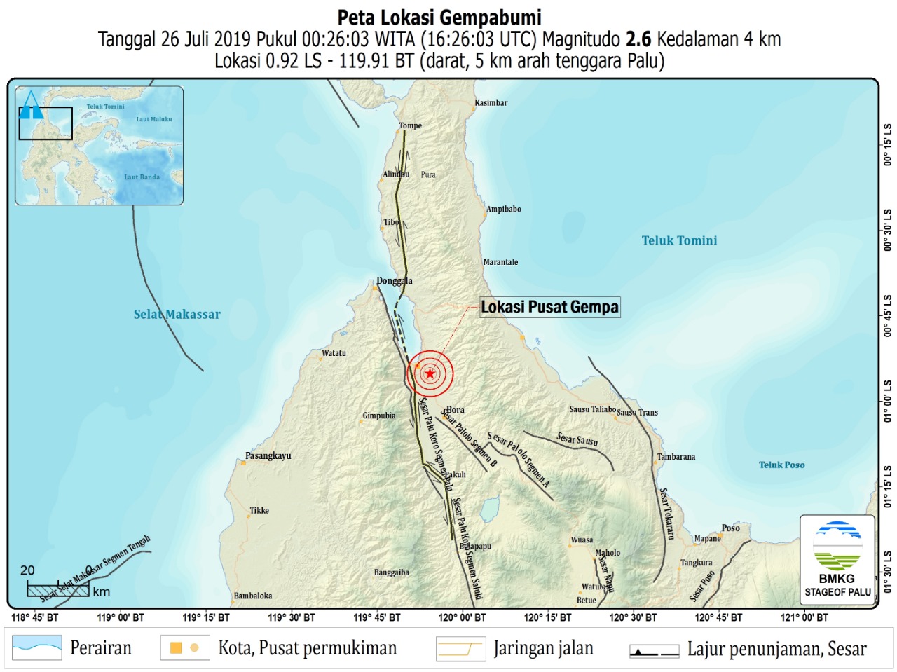 Gempa Bumi 2,6 SR Guncang PaluJuli 25, 2019Juli 25, 2019oleh Redaksi-oleh Redaksi ilustrasi-seismogram-gempaWarga Palu dan sekitarnya sempat kaget akibat guncangan gempa bumi tersebut. Reporter: Situr WijayaLaman sebelumnyaHalaman: 1 2Jangan LewatkanGubernur Anwar dan KLH Satukan Langkah Tertibkan Tambang Ilegal Gubernur Anwar Hafid Perluas Program Berani Cerdas hingga S2–S3, Siapkan SDM Unggul Sulteng 2045PT Wadi Al Aini Membangun Tegaskan Legalitas IUP dan Klarifikasi Aksi Demo di Desa Loli OgeLDK Al-Abrar Pecat Kader yang Sudah 3 Minggu Keluar, Mahasiswa Menuntut TransparansiDukungan Infrastruktur Nataru, Jalan Nasional Ampana – Balingara -Bunta – Pagimana Rampung