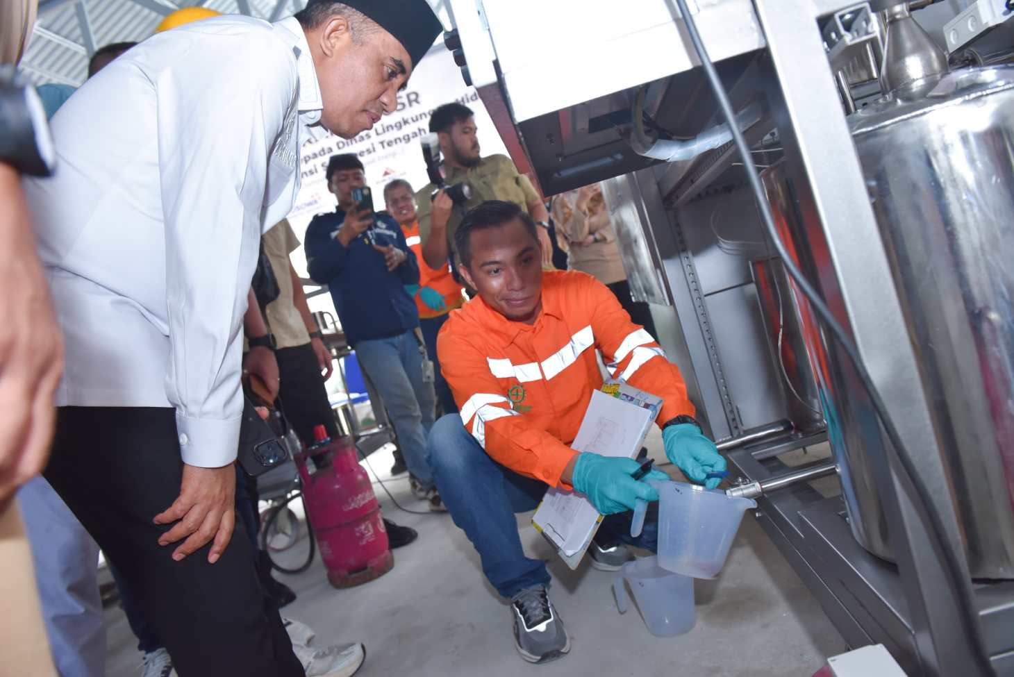 Gubernur Anwar Hafid menyaksikan pengolahan sampah plastik menjadi BBM yang digagas DLH Sulteng. Foto: Ist