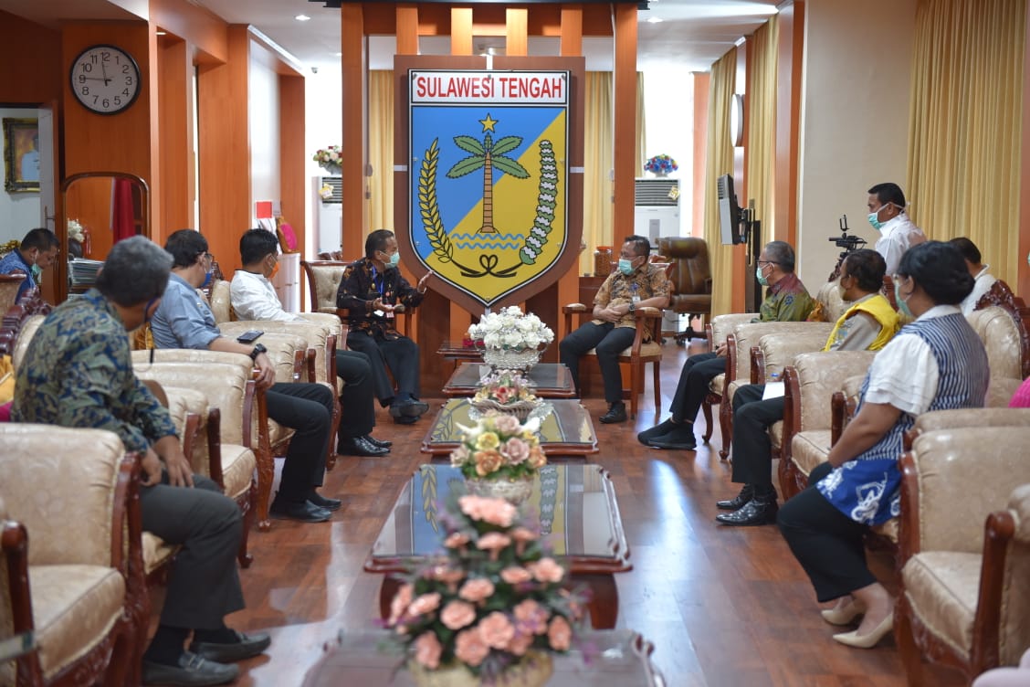 PALU, PosRakyat.com – Gubernur Sulawesi Tengah, Longki Djanggola didampingi Sekdaprov, Mohammad Hidayat Lamakarate menerima kunjungan Kepala Bandara Sis-Aljufri Mutiara Palu, Ubaedillah dan perwakilan makapai penerbangan di uang kerja gubernur, Jumat (8/5/2020).