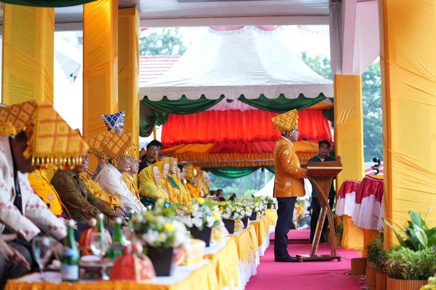 Kedatangan gubernur bersama rombongan disambut Wali Kota Palu Hadianto Rasyid dan Wakil Wali Kota Imelda Liliana Muhidin. Prosesi adat khas Kaili, seperti pemasangan siga dan sompulu serta tarian tradisional, turut memeriahkan peringatan hari jadi Kota Palu tahun ini.
