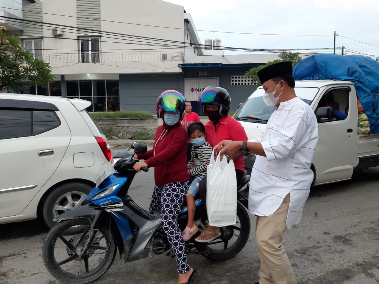 Ketua Bappda DPC Gerindra Palu, Mohamad Ikhsan Kalbi bersama sejumlah kader partai membagikan takjil di simpang empat lampu merah jalan Touwa, Sabtu 8 Mei 2021. FOTO: BAKOM GERINDRA