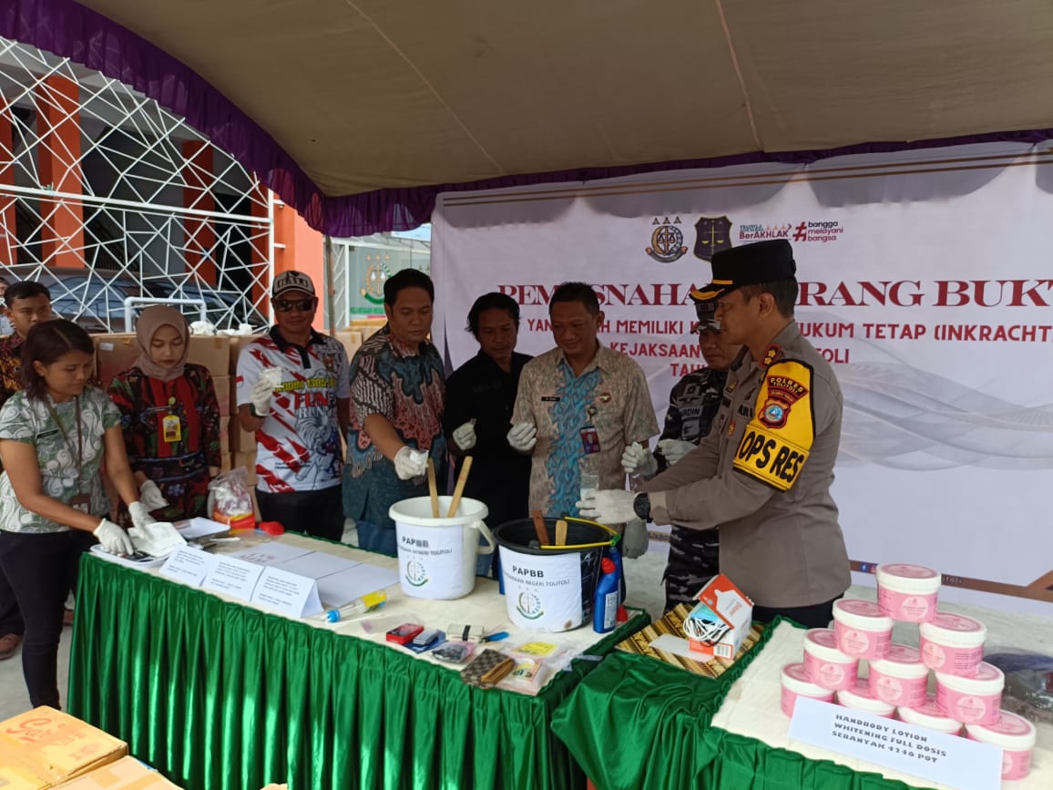 PosRakyat – Kejaksaan Negeri (Kejari) Kabupaten Tolitoli memusnahkan sejumlah barang bukti tindak kejahatan, di antaranya berupa narkoba, rokok ilegal dan Kosmetik Ilegal yang ditangani kejaksaan Tolitoli