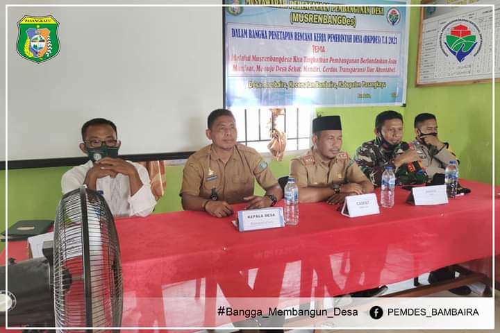 Kegiatan itu mengusung tema “Melalui Musrenbang Desa kita tingkatkan pembangunan berlandaskan asa manfaat, menuju Desa Sehat, Mandiri, Cerdas, Transparansi, dan Akuntabel,” yang dipusatkan di kantor Desa Bambaira, Selasa, 24 November 2020.