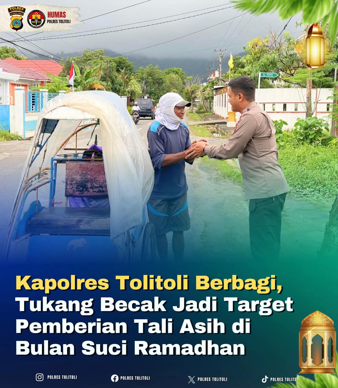 Pada Selasa (11/3/2025) siang, Kapolres Tolitoli mendatangi sejumlah tukang becak yang tengah menunggu penumpang di Jalan Daud Lapau, Kabupaten Tolitoli, Sulawesi Tengah. Dalam kesempatan tersebut, perwira lulusan Akademi Kepolisian (Akpol) tahun 2006 itu menyerahkan bantuan tali asih secara langsung.