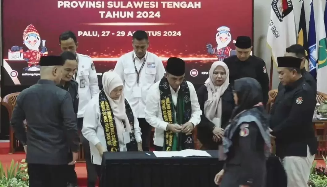PosRakyat – Komisi Pemilihan Umum (KPU) Sulawesi Tengah resmi menerima pendaftaran pasangan bakal calon (balon) gubernur dan wakil gubernur Sulawesi Tengah 2024, Dr. Anwar Hafid, M.Si dan dr. Reny A. Lamadjido, M.Kes. Pendaftaran tersebut ditandai dengan penandatanganan berita acara penerimaan oleh komisioner KPU Sulteng, yang diawali oleh Ketua KPU Sulteng, Risvirenol, SH, di Aula Kantor KPU Sulteng, Kota Palu, pada Kamis (29/8/2024).