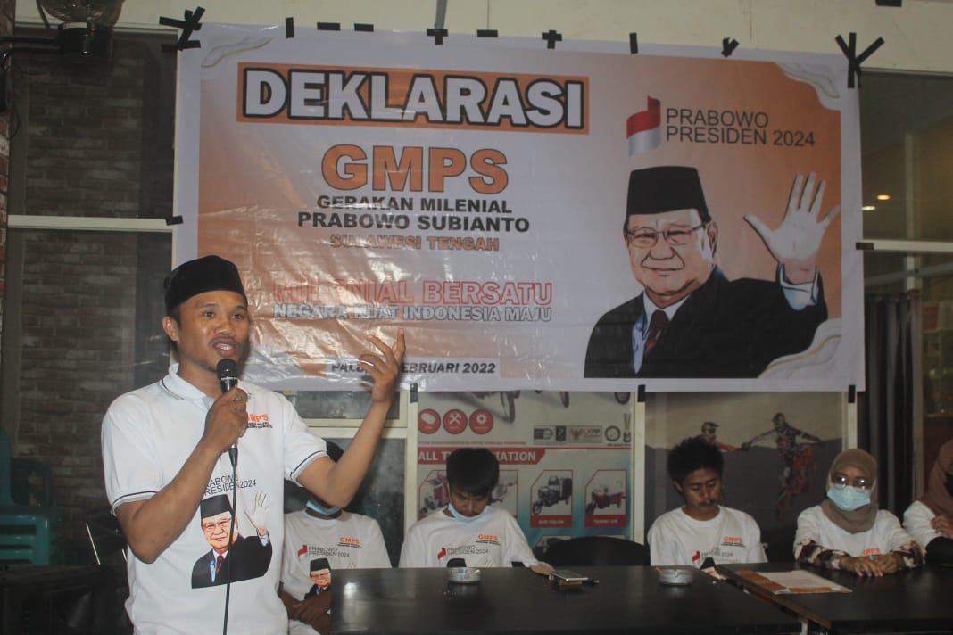 PosRakyat – Gerakan Milenial Prabowo Subianto (GMPS) Sulawesi Tengah (Sulteng) mendeklarasikan dukungan kepada Ketua Umum Gerindra Prabowo Subianto sebagai calon Presiden 2024 di salah satu warung kopi, jalan Diponegoro Kota Palu, Sabtu.