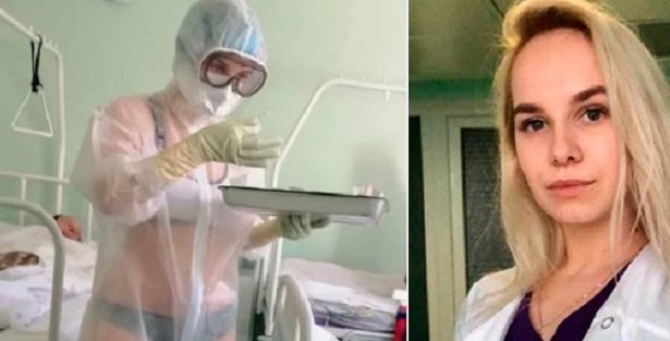 Saat itu, seorang pasien memotret momen ketika Zhukova hanya mengenakan bikini di balik APD, di mana dia juga memakai masker dan kacamata pelindung.