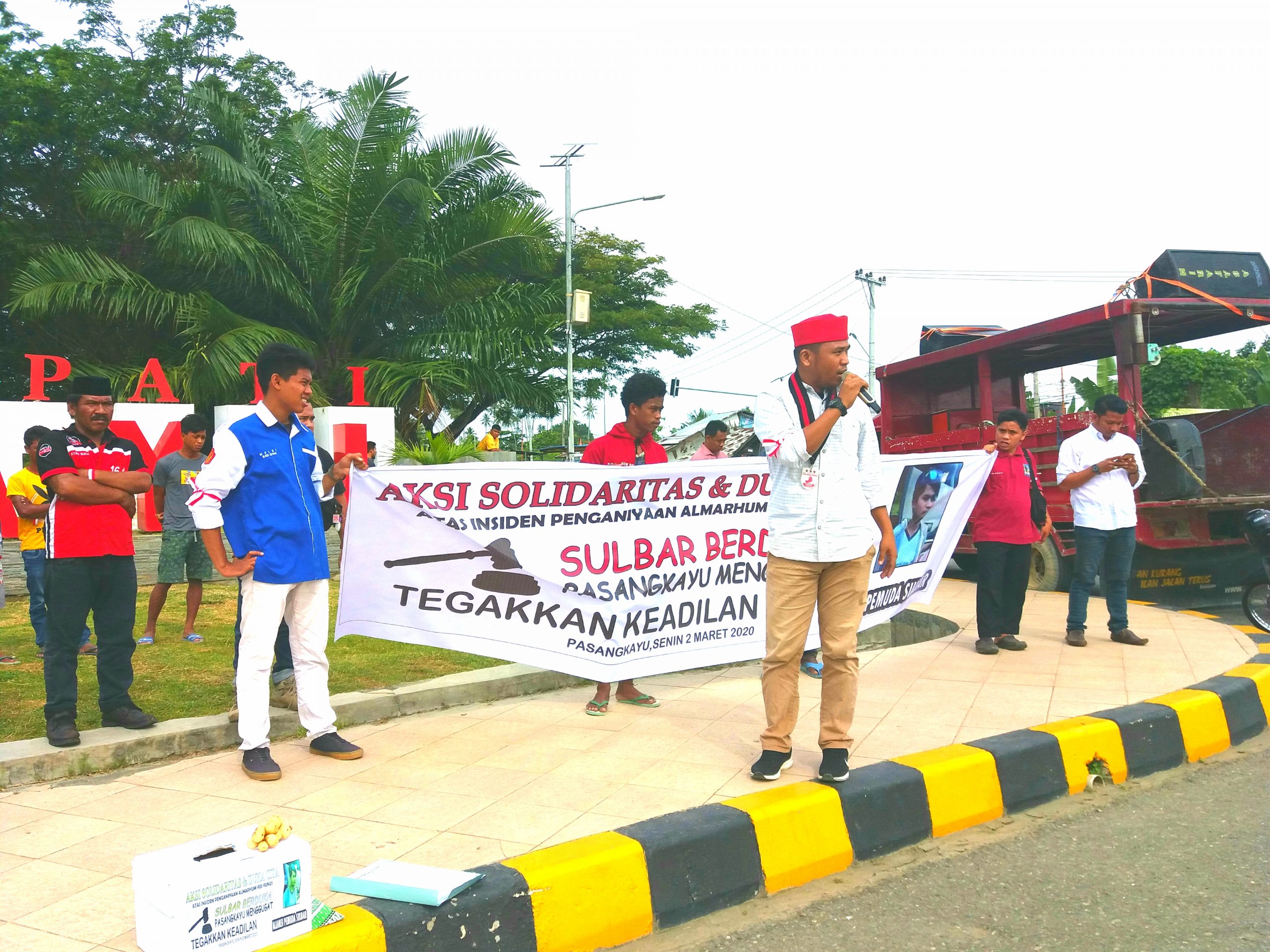 Sultan Hasanuddin, koordinator aksi Solidaritas Pemuda Sulawesi Barat, saat berorasi, menyampaikan beberapa poin tuntutan. Di antaranya, penegakan hukum dan perlindungan HAM di bumi Indonesia.
