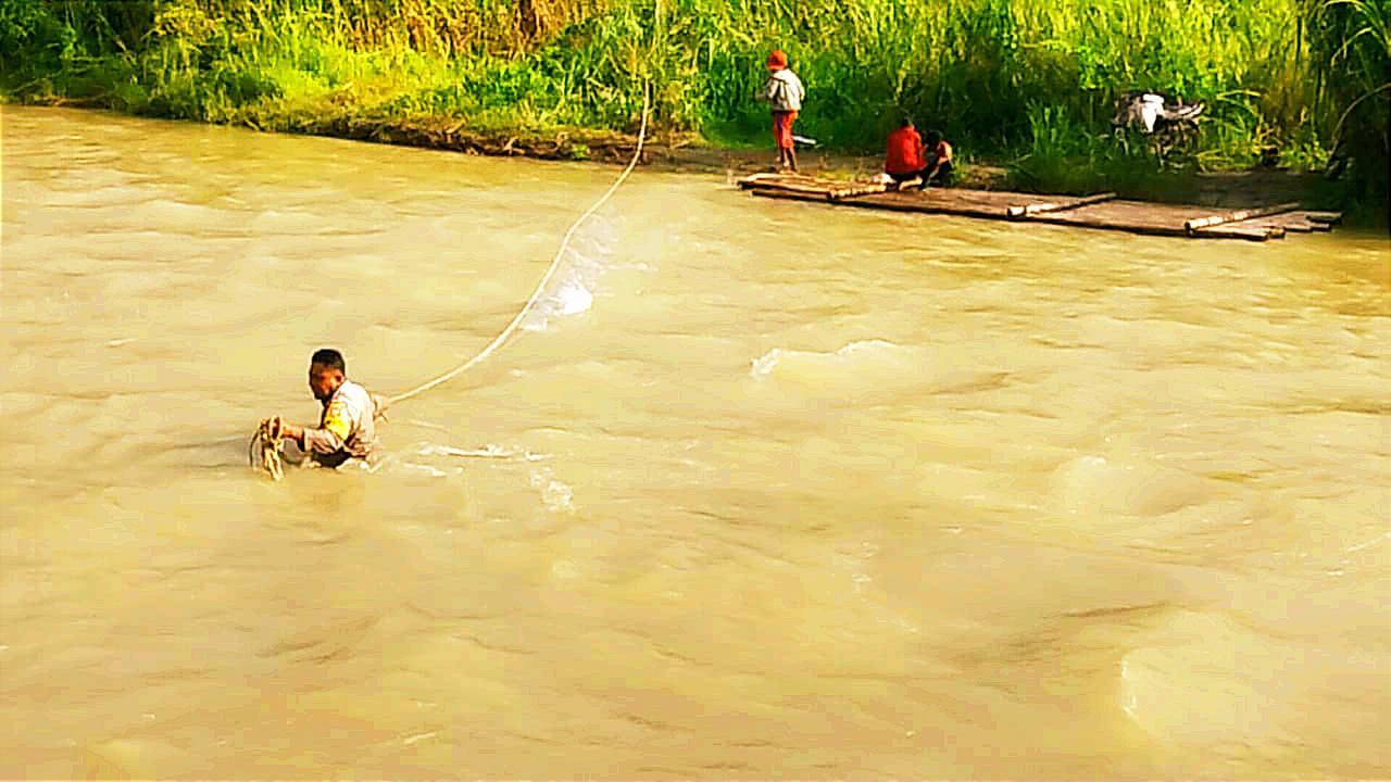 Polisi Annas menyeberangi sungai yang arusnya deras itu tak kala mendengar warganya tidak bisa sekolah karena akses penyeberangan sungai talinya terputus.