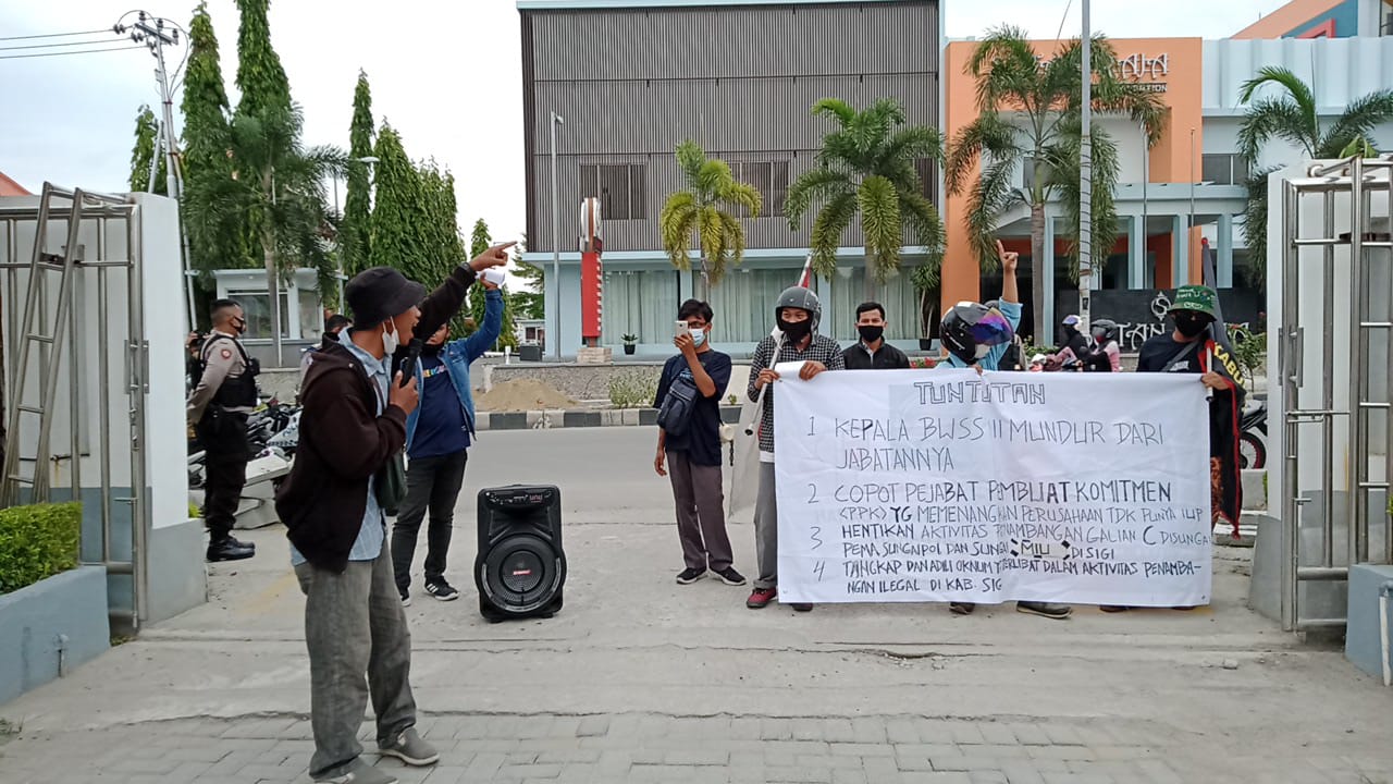 Seorang aksi Mastang dalam orasinya di depan halaman kantor BWSS III meminta BWSS bertanggung jawab atas penambangan ilegal galian C yang telah berlangsung sejak beberapa bulan lalu hingga saat ini di kabupaten Sigi.