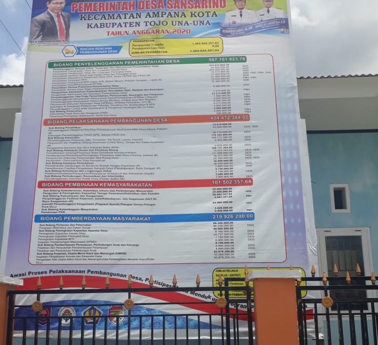 Pemerintah Desa Sansarino, di Kecamatan Ampana Kota, Kabupaten Tojo Una-Una, Provinsi Sulawesi Tengah, mempublikasikan Pengelolaan Anggaran APBDes tahun 2019 hingga APBDes tahun 2020 di papan transparansi atau baliho berukuran besar di kantor desa Sansarino.