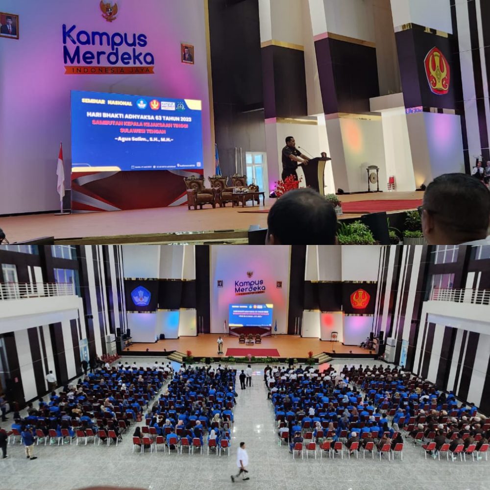 PosRakyat – Kepala Kejaksaan Tinggi Sulawesi Tengah (Kajati Sulteng) Agus Salim, SH., MH menyampaikan sambutanya pada Seminar Nasional dalam rangka Hari Bhakti Adhyaksa ke – 63 tahun, bertempat di auditorium Universitas Tadulako (Untad), Senin, 17 Juli 2023.