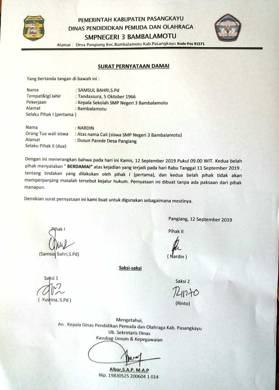 Pihak SMP Satap Pangiang menyambut baik atas itikad baik yang disampaikan oleh pihak keluarga CL.