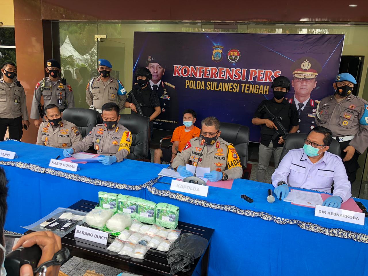 Kapolda Sulteng didampingi Dirresnarkoba, Kabidhumas dan Dirtahti Polda Sulteng kepada media menerangkan bahwa Ditresnakoba Polda Sulteng pada hari Sabtu (24/10/2020) pukul 16.30 wita di Pos pemantau covid.19 Kelurahan Watusampu Kota Palu berhasil menggagalkan dua orang yang diketahui membawa masuk narkoba jenis shabu.