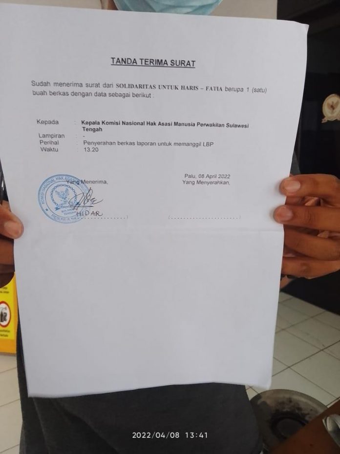 PosRakyat – Agussalim, SH selaku Koordinator Nasional Serikat Pekerja Hukum Progresif (SPHP) mewakili Tim Advokat Rakyat Sulteng untuk Haris Azhar dan Fatia Maulidiyanti, menyampaikan bahwa telah menyerahkan surat laporan kepada Komnas HAM perwakilan Sulawesi Tengah. Hal ini bertujuan untuk memanggil Luhut Binsar Pandjaitan (LBP) terkait dugaan pelanggaran Hak Asasi Manusia (HAM).