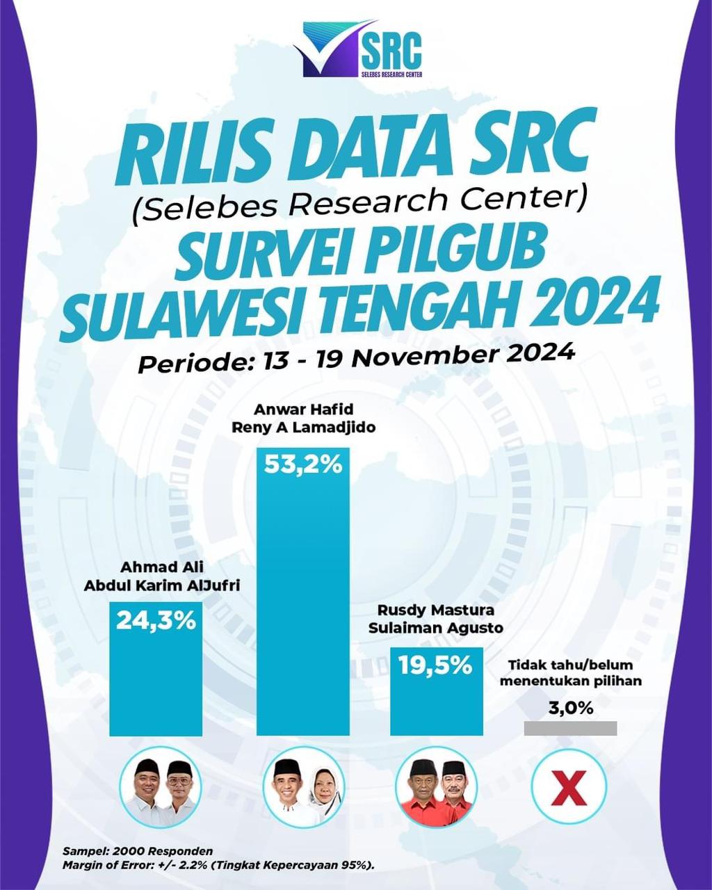 PosRakyat – Lembaga Riset dan Survei Selebes Resource Center (SRC) kembali merilis hasil survei elektabilitas calon Gubernur dan Wakil Gubernur Sulawesi Tengah 2024.