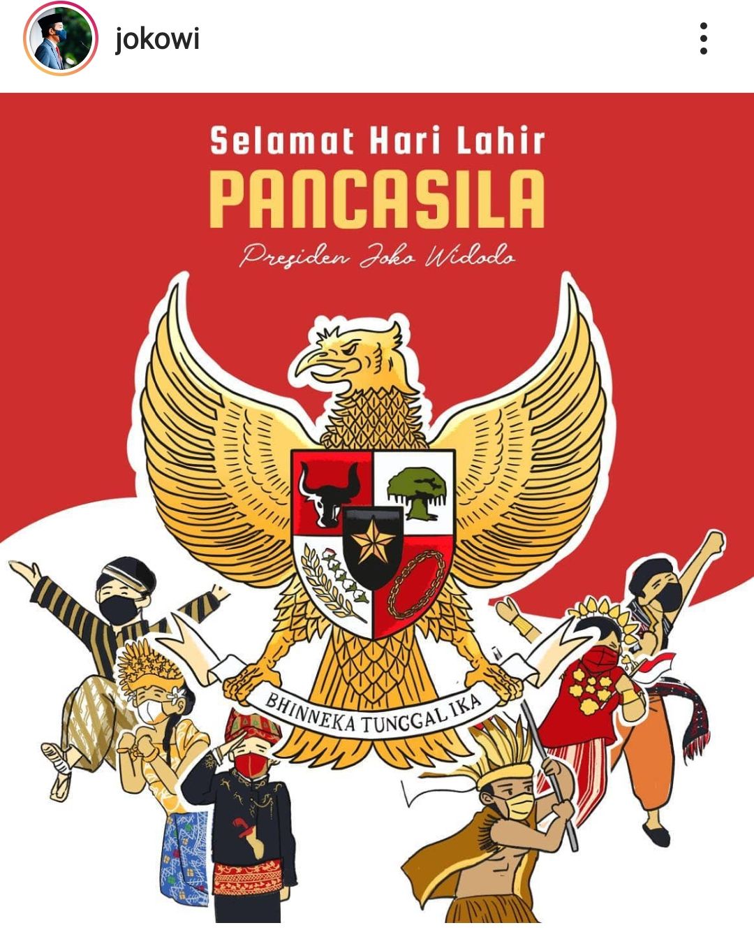 Dikutip dari Instagram resminya, Presiden Jokowi memberikan ucapan Hari Lahir Pancasila.Menurut Jokowi, bangsa Indonesia telah melayani berbagai zaman yang berpedoman pada nilai-nilai Pancasila.
