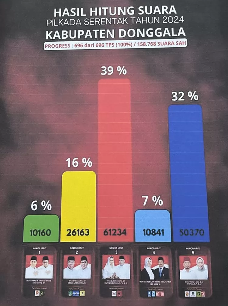 Soraya menyatakan bahwa berdasarkan penghitungan real count internal menggunakan data C1 dari 696 tempat pemungutan suara (TPS) se-Kabupaten Donggala, pasangan VEGATA unggul dengan perolehan 61.234 suara atau 39 persen.