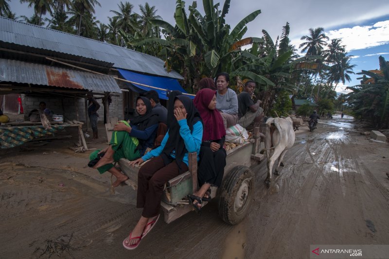 Gerobak sapi mengangkut warga di genangan akibat banjir bandang di Dusun 1 Desa Bangga, Kecamatan Dolo Selatan, Kabupaten Sigi, Sulawesi Tengah, Selasa (28/5/2019). Banjir bandang yang terjadi pada Minggu (26/5) malam itu adalah yang ketiga kalinya sejak 28 April lalu yang menerjang dusun 2 dan 3. Setelah didera bencana berulang kali, pemerintah setempat menyatakan butuh waktu yang cukup lama agar wilayah itu layak huni kembali. ANTARA FOTO/Basri Marzuki/pras (ANTARA FOTO/BASRI MARZUKI)